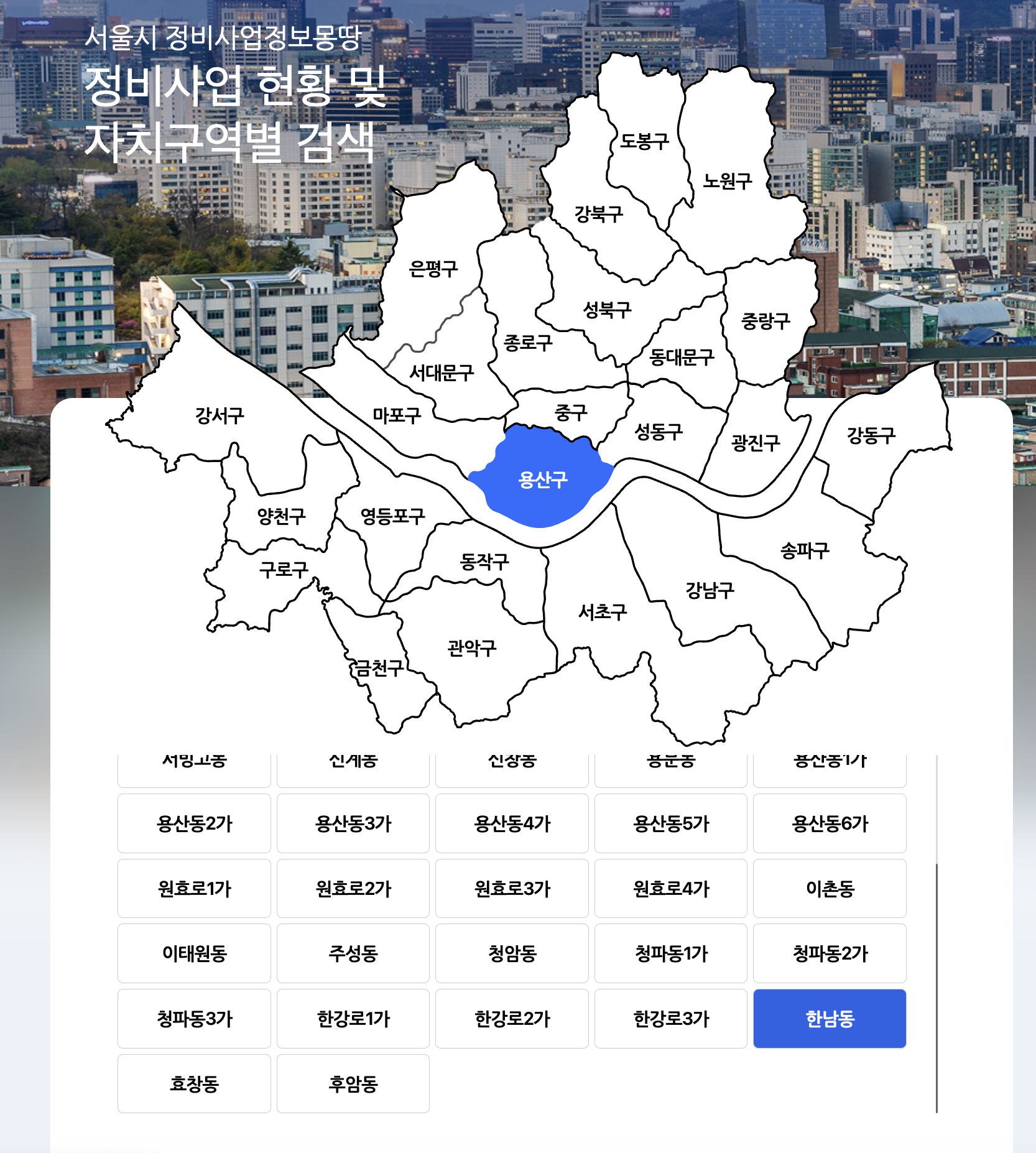 용산구를 클릭하니, 용산구에 있는 동이 나오게 되는데요.