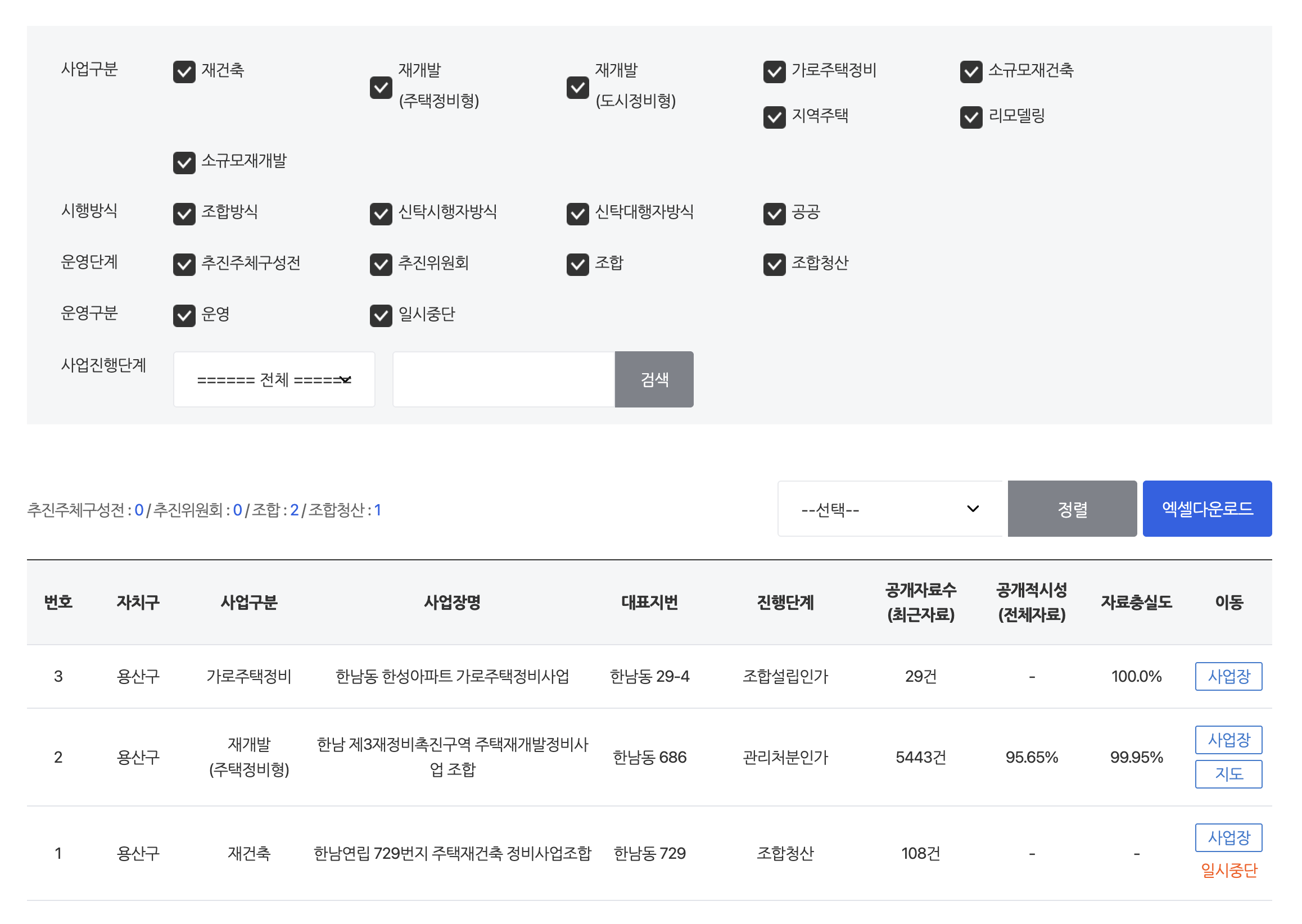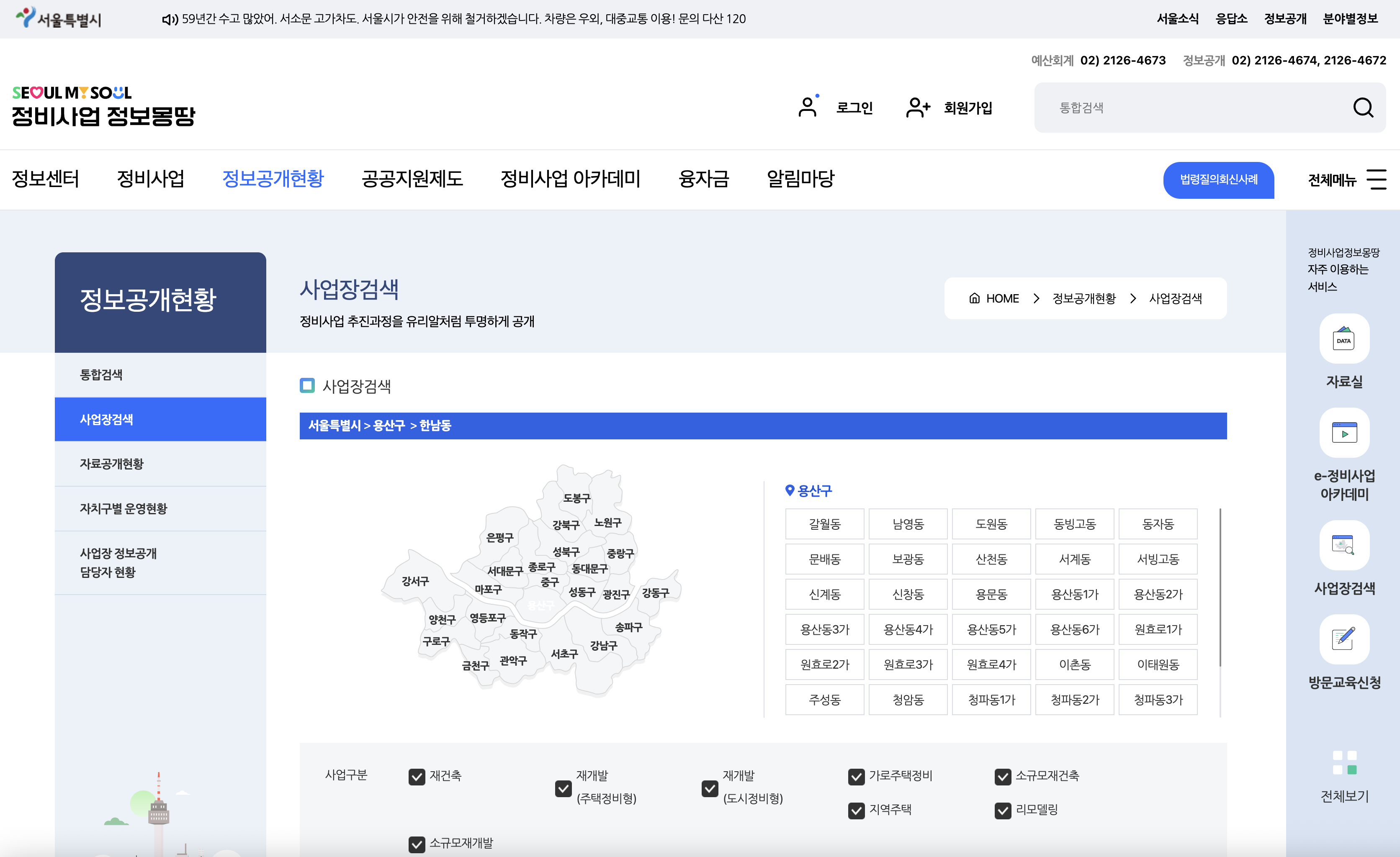 예를들어 '용산구 > 한남동' 에서 진행중인 사업구분은 아래와 같습니다.