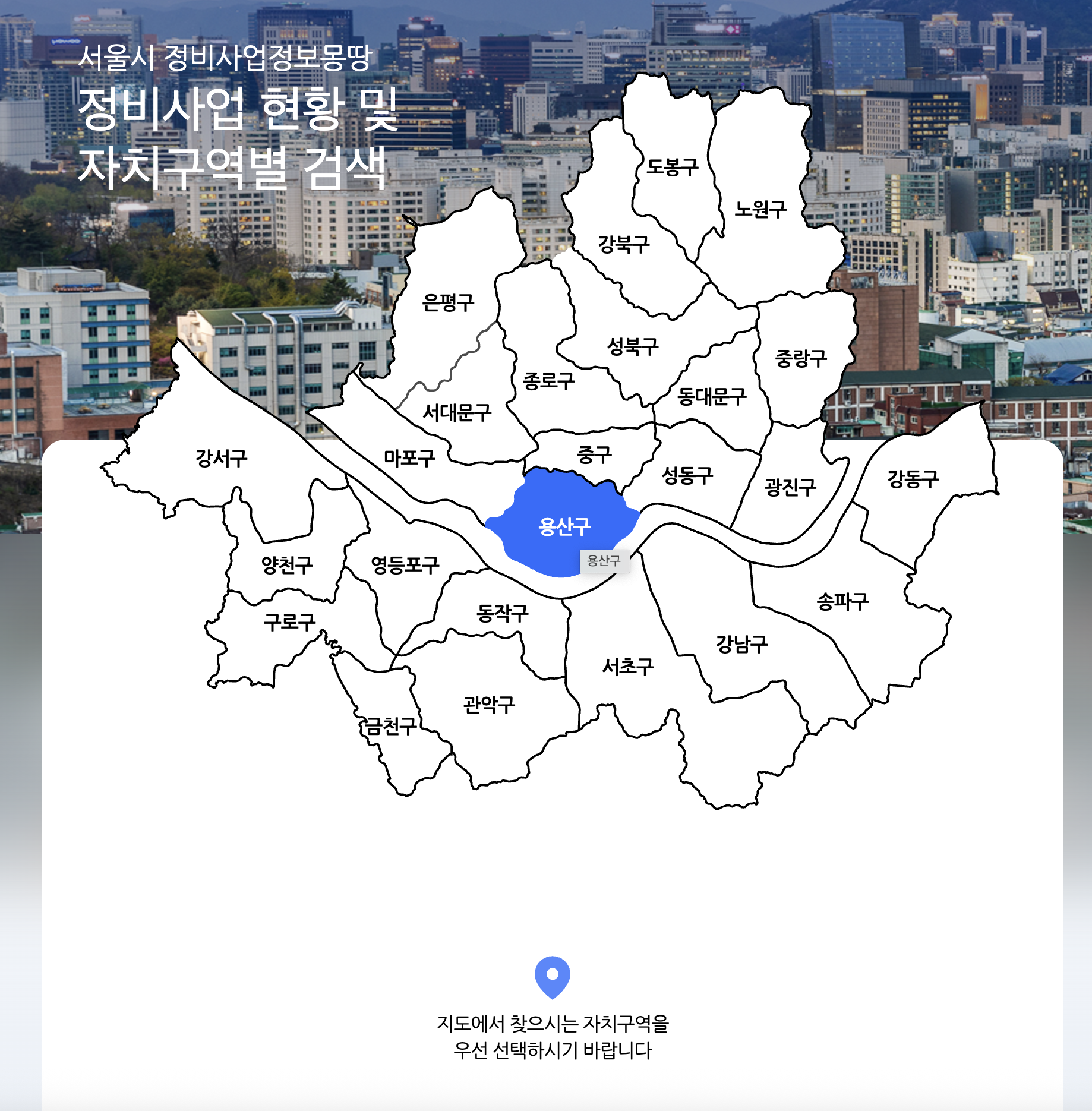 메인 화면에는 서울시 지도가 있습니다. 지도에서 원하는 자치구를 클릭하면, 자세한 동 이 나옵니다.