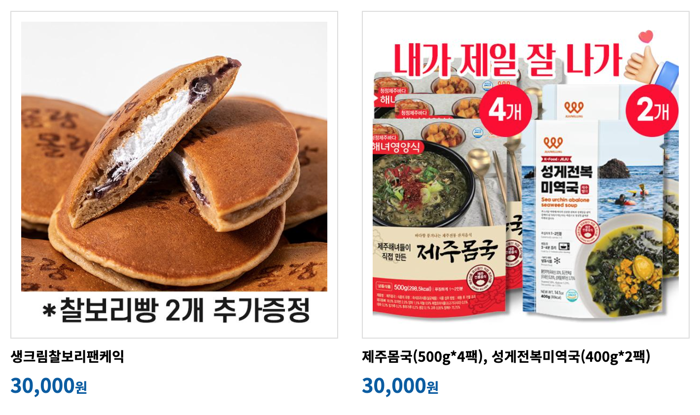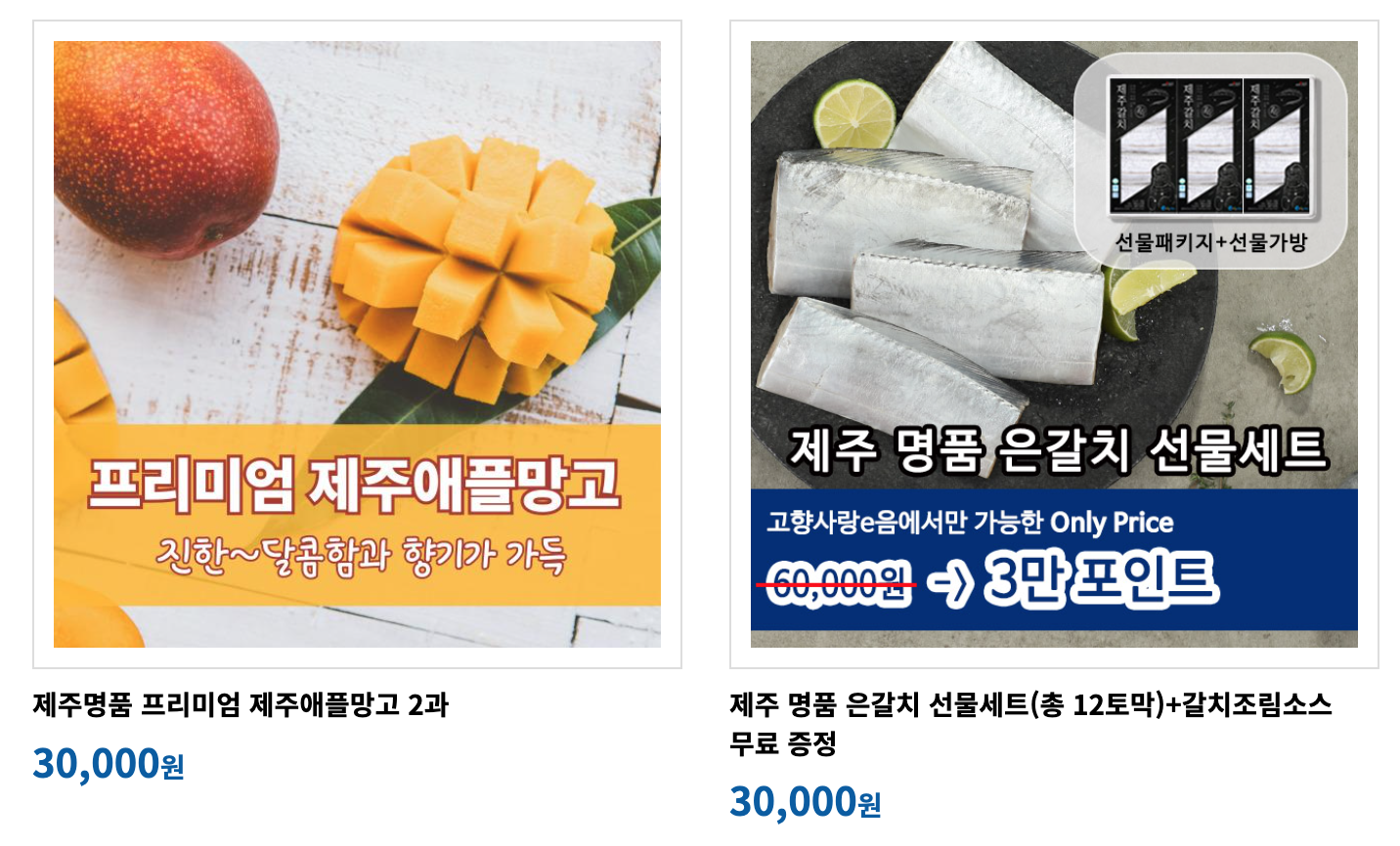 | 수산물 | 옥돔, 갈치, 전복세트 | 10 ~ 30만원 | 서귀포 수협 직배송 |