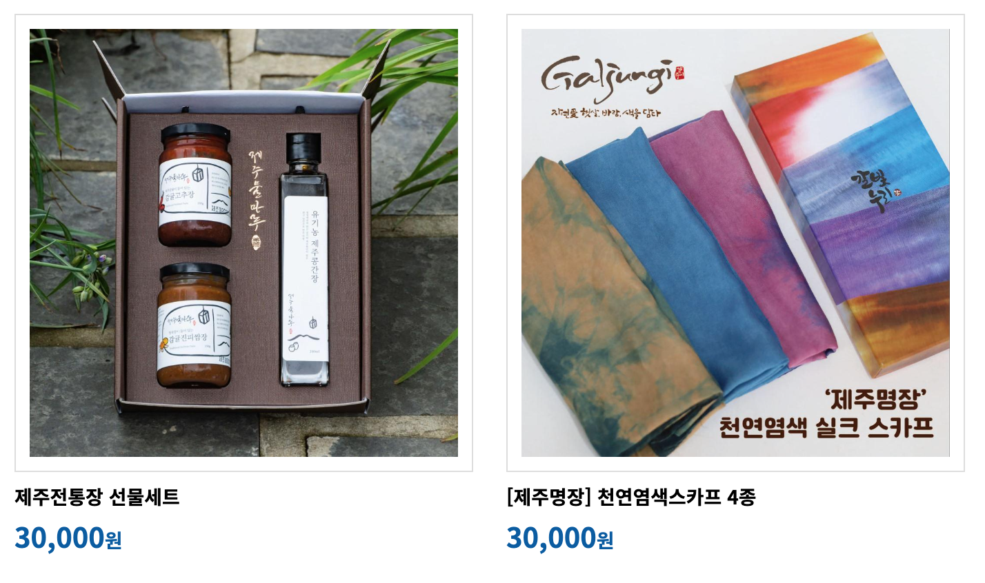 | 특산공예품 | 제주돌하르방 수공예품, 비누세트 | 5 ~ 10만원 | 사회적기업 협업 상품 |