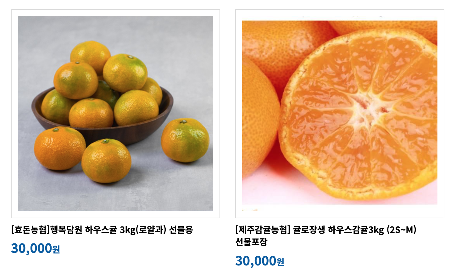 | 과일 | 제주 감귤, 한라봉, 천혜향 세트 | 5 ~ 20만원 | 친환경 농가 직배송, 신선도 보장 |